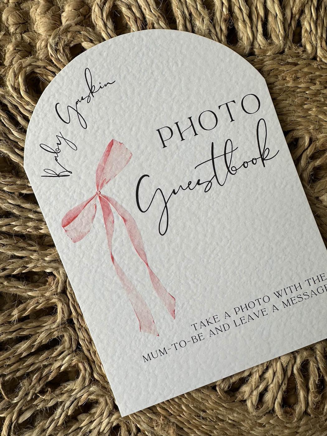 This personalised arch baby shower sign is the perfect finishing touch to the occasion. Completely customised to fit you - making it one of a kind, use the personalised box provided to amend the arch text and any other details including the colour of the bow. Hand cut to an arch shape and printed on high quality textured 280gm2 card, this A5 sign is great to put in a frame or have in a stand.