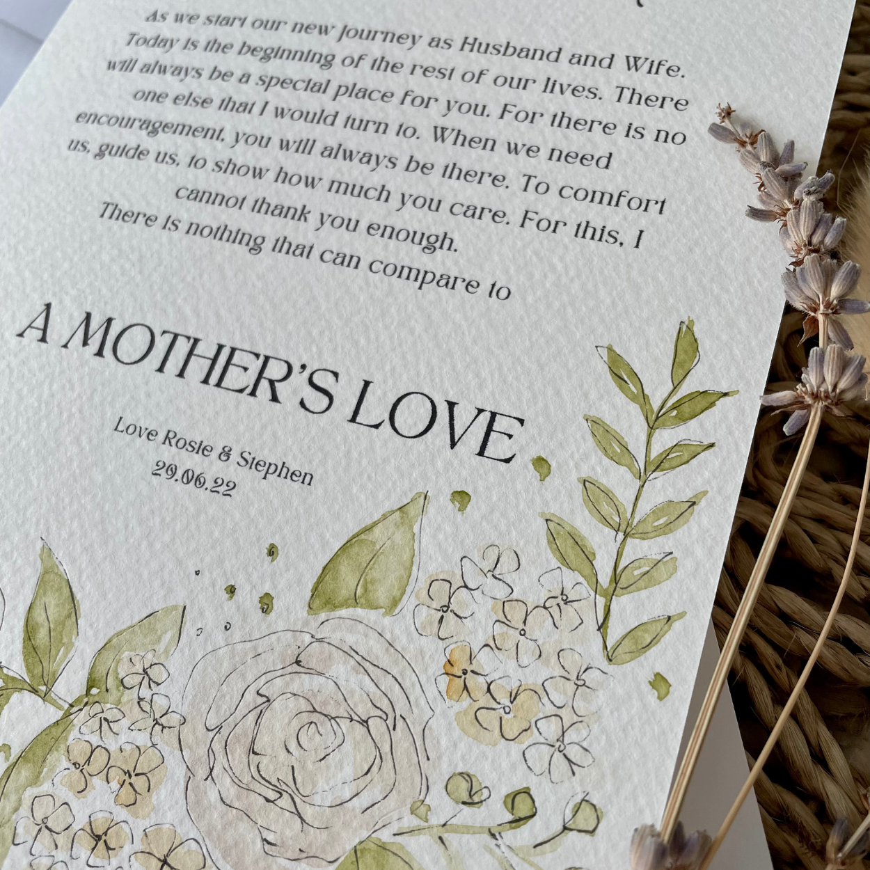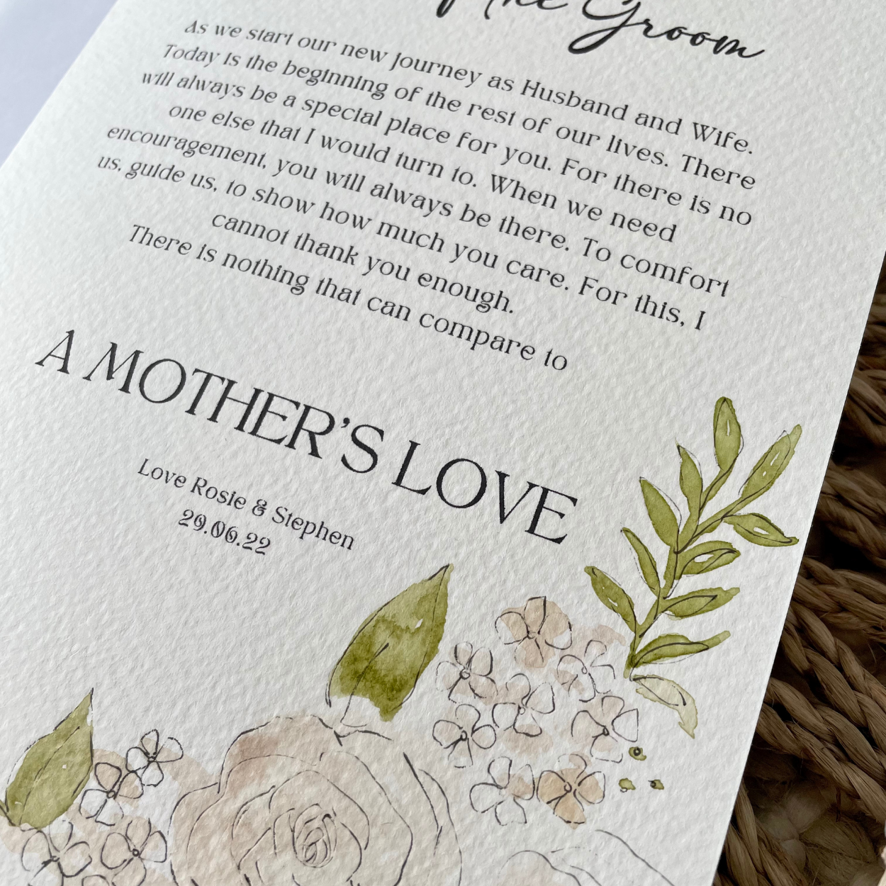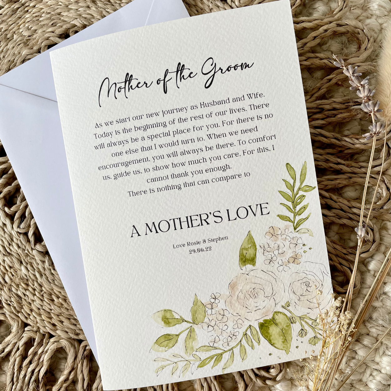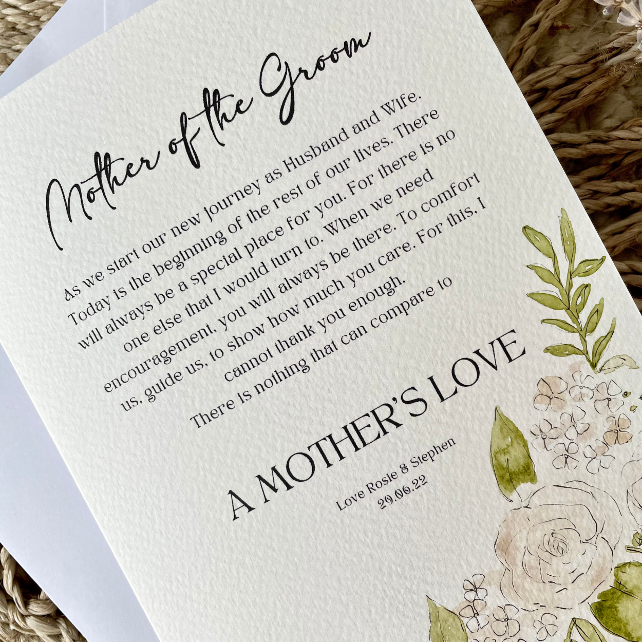 This personalised card is the perfect finishing touch to make the occasion that extra special. Making a perfect keepsake for the Mother Of The Groom, this card is printed then individually hand painted making it bespoke to you.