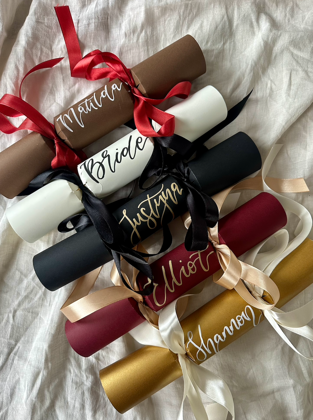 The ultimate seasonal decor for you Christmas table this year, the personalised DIY cracker. Each one handwritten and customised, coming in a selection of colours and supplied with your chosen colour ribbon. Each cracker comes with a paper hat, cracker snap and either a classic cracker joke or charade, helping to sprinkle Christmas fun around your dining table.