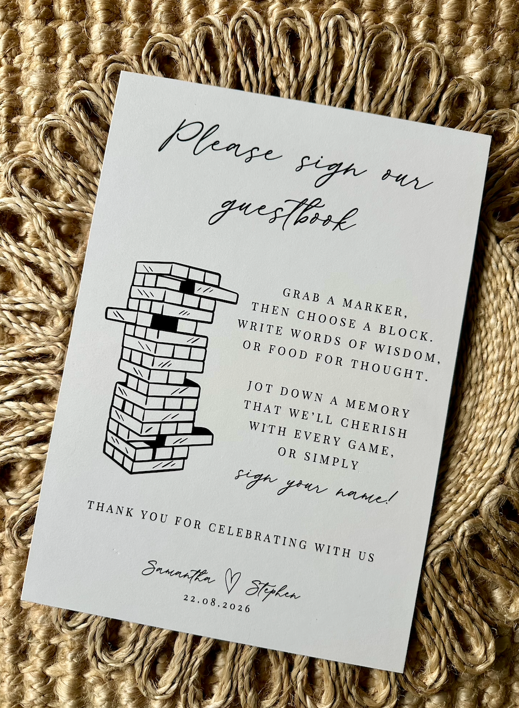 This Jenga guest book sign is the perfect addition to your big day. Personalised to suit you making it bespoke and one of a kind, ready for a game set match to compliment your Jenga Game. Ideal for game lovers and making a great keepsake, the Jenga guestbook is such a fun wedding idea.